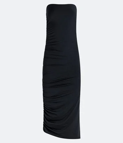 Vestido midi, em meia malha, tomara que caia, efeito metalizado e franzidinhos na lateral.