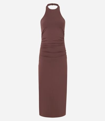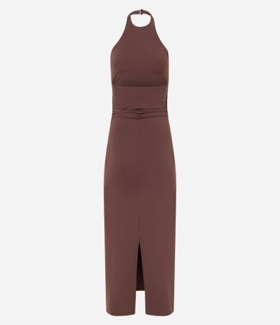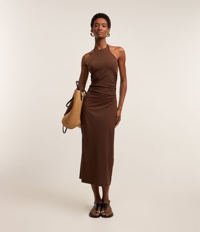 Ref: Vestido midi, frente e única, franzidinho lateral, em microfibra leve e com fenda na parte de trás.