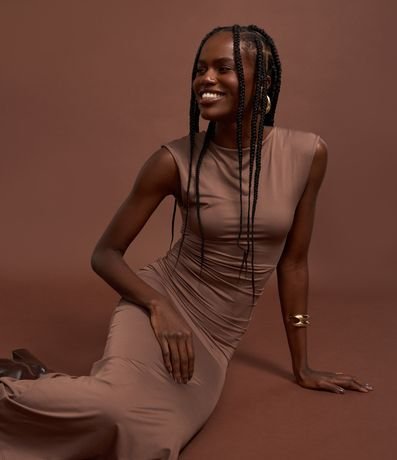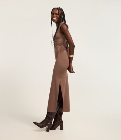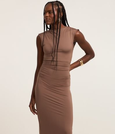 Vestido Midi em Microfibra Ombro com Caimento e Franzidos