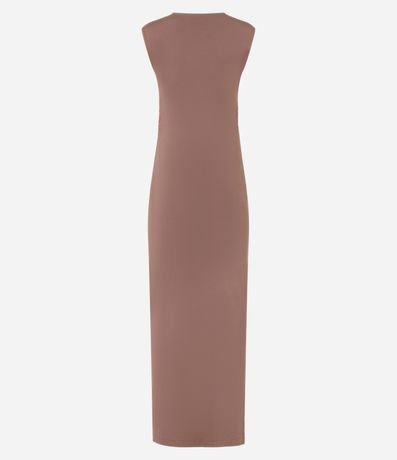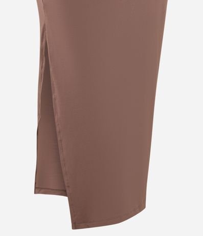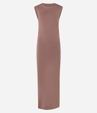 Vestido feminino confeccionado em microfibras com boas práticas ambientais, decote redondo com caimento no ombro. No comprimento midi, detalhes franzidos  e fenda.