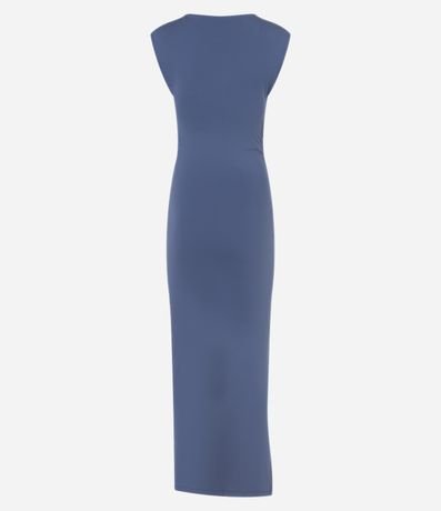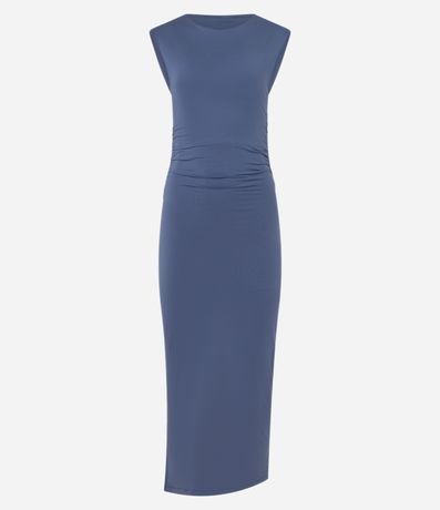 Ref: Vestido feminino confeccionado em microfibras com boas práticas ambientais, decote redondo com caimento no ombro. No comprimento midi, detalhes franzidos e fenda.