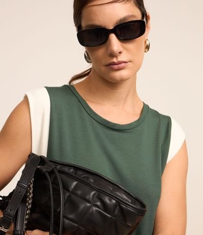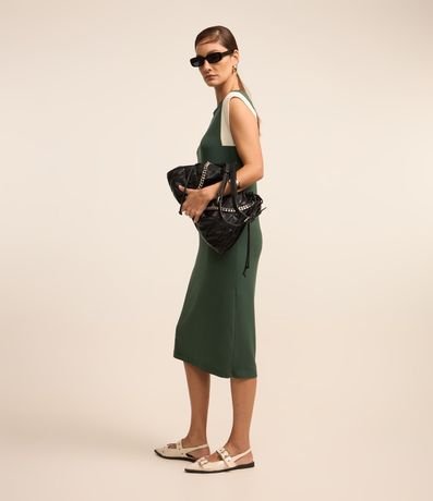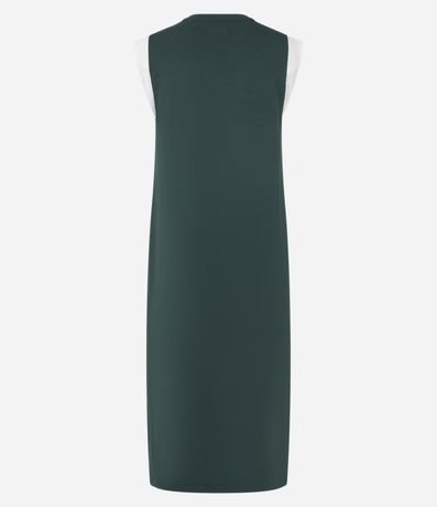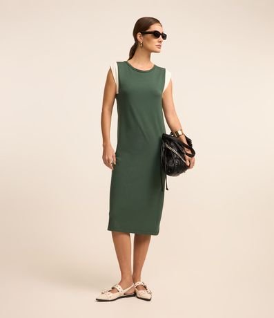 Vestido feminino confeccionado em moletinho, com gola redonda e sem mangas. De comprimento midi e sem estampa, possui detalhe contrastante nas cavas.