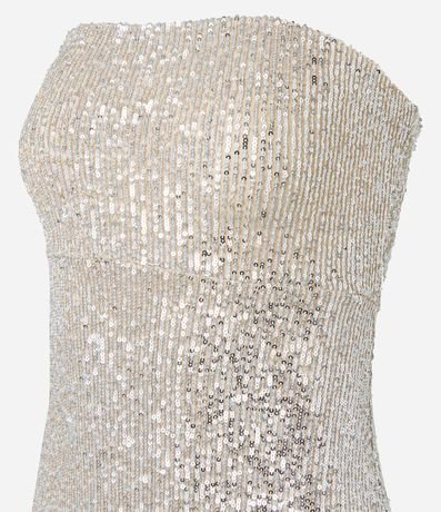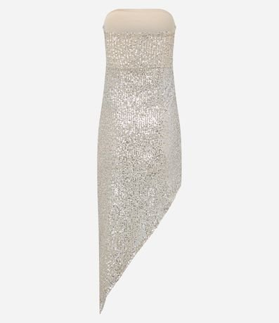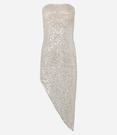 Vestido midi com decote tomara que caia, em paetês metalizados, franzido lateral e barra assimétrica.