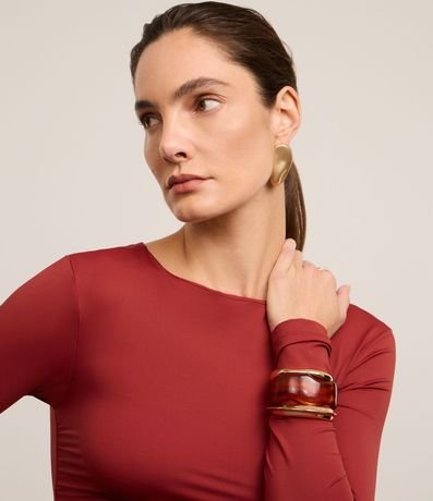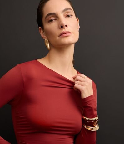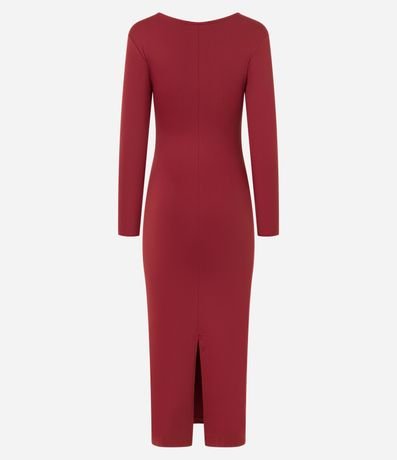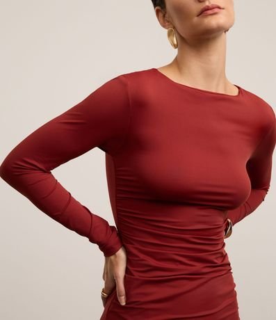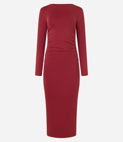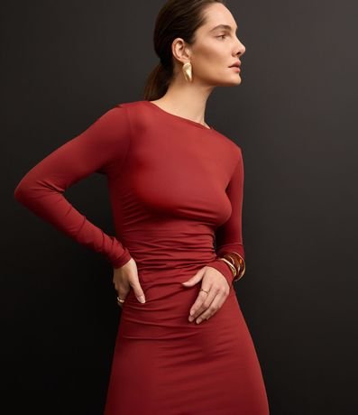 Ref: Vestido manga longa, confeccionado em poliamida com drapeados nas laterais, decote canoa e fenda na parte de trás.