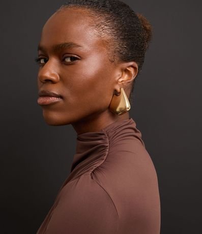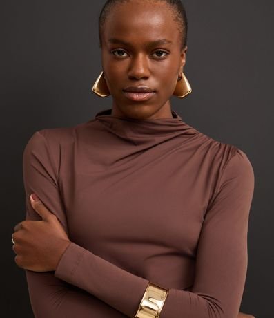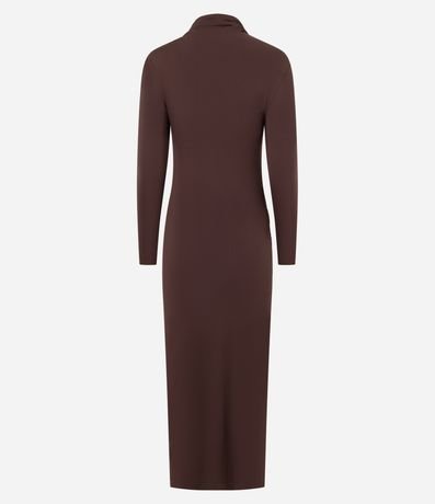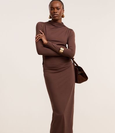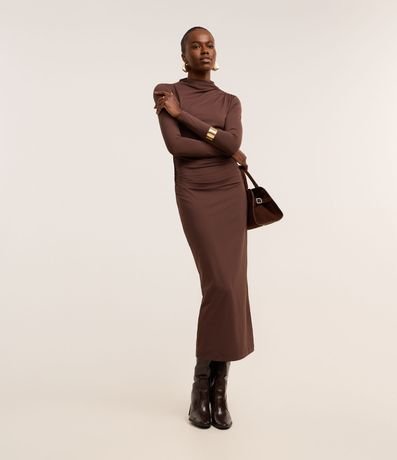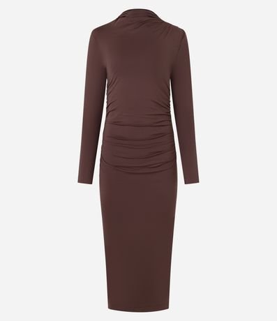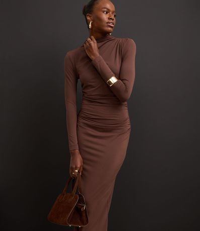 Vestido midi feminino, confeccionado em poliamida, com golinha alta, mangas longas e detalhes franzidos nas laterais. A peça também conta com superfície sem estampa.