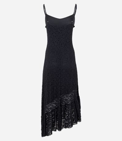 Vestido midi feminino em renda com alças finas, decote levemente arredondado, babado aplicado na parte superior, forro interno curto e barra assimétrica em renda vazada.