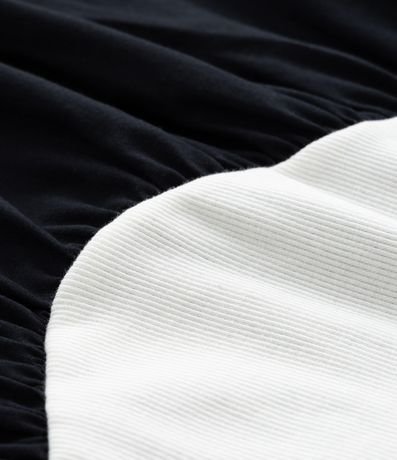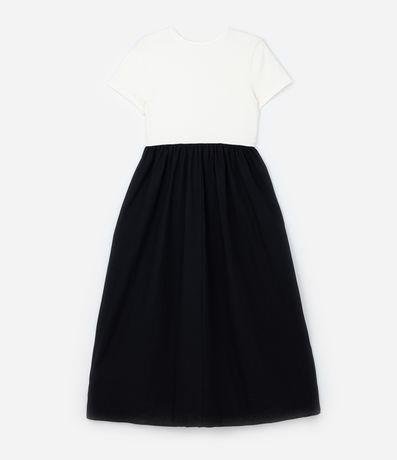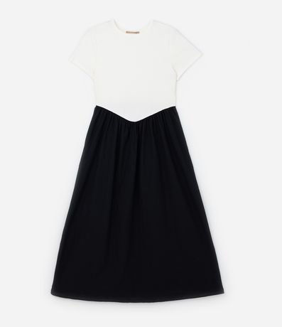 Ref: Vestido feminino confeccionado em ribana de algodão certificado bci com boas práticas ambientais, peça com decote redondo, manga curta, e contrates de cores entre busco e saia.