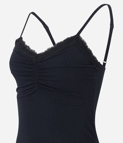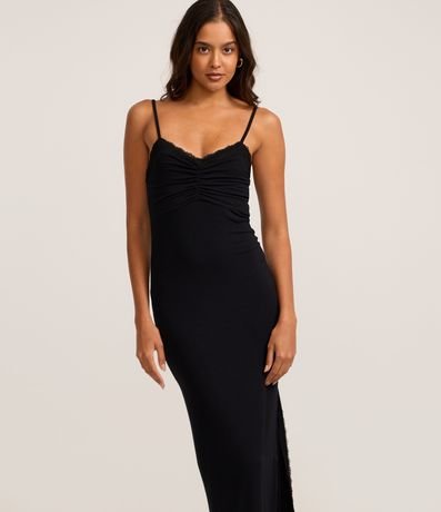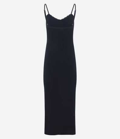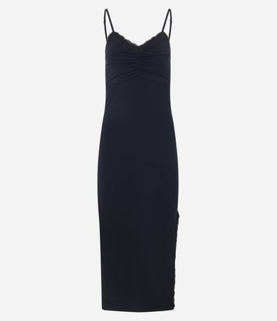 Ref: Vestido midi confeccionado em ribana, com alças finas ajustáveis e decote adornado com renda delicada. Possui fenda lateral com acabamento em renda, trazendo charme e sensualidade ao visual. Peça ajustada ao corpo, confeccionada em viscose certificada.