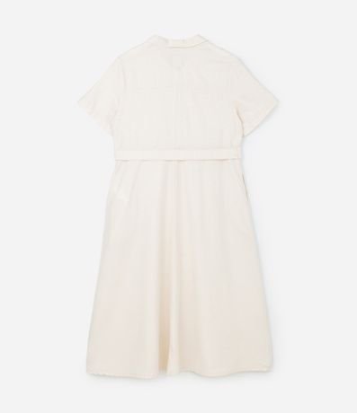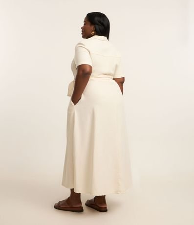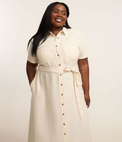 Ref: Vestido feminino Curve & Plus Size confeccionado em sarja de algodão certificado bci, com gola colarinho, abotoamento frontal, bolsos, manga curta e amarração na cintura. Peça no modelo midi.