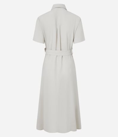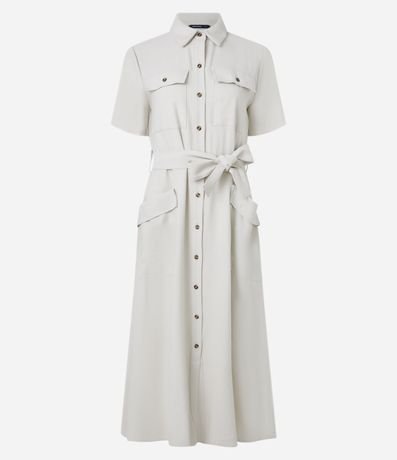 Vestido feminino de comprimento midi, confeccionado em sarja, com decote camisa e mangas curtas. Sem estampa, possui abotoamento frontal total, bolsos utilitários na altura do peito e faixa para amarração na cintura.