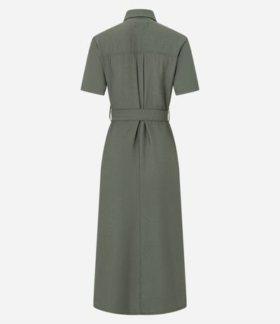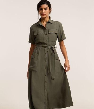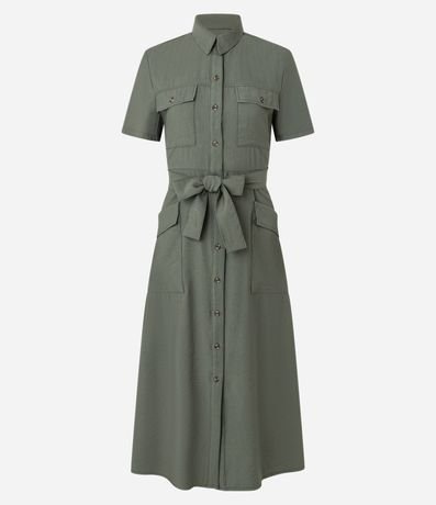 Ref: Vestido feminino de comprimento midi, confeccionado em sarja, com decote camisa e mangas curtas. Sem estampa, possui abotoamento frontal total, bolsos utilitários na altura do peito e faixa para amarração na cintura.