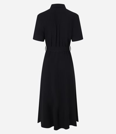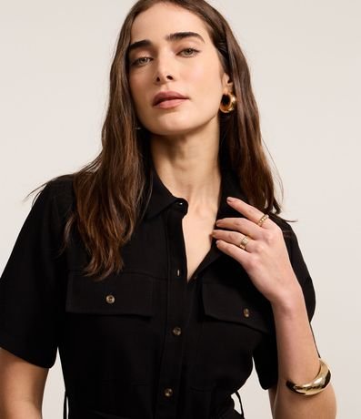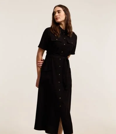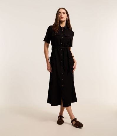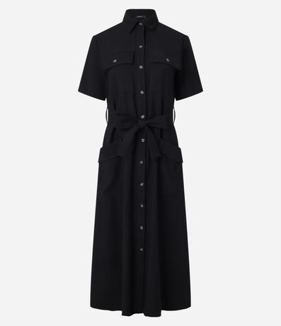 Ref: Vestido feminino de comprimento midi, confeccionado em sarja, com decote camisa e mangas curtas. Sem estampa, possui abotoamento frontal total, bolsos utilitários na altura do peito e faixa para amarração na cintura.