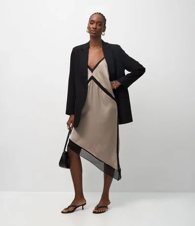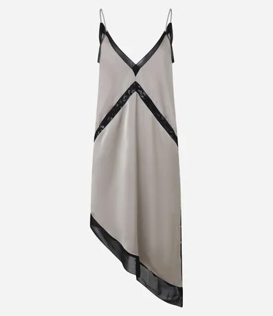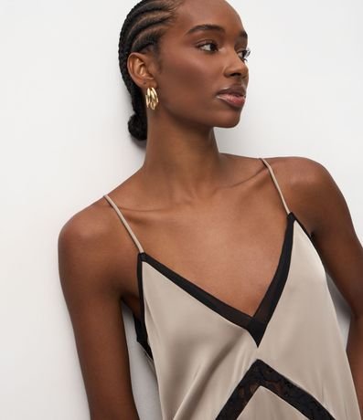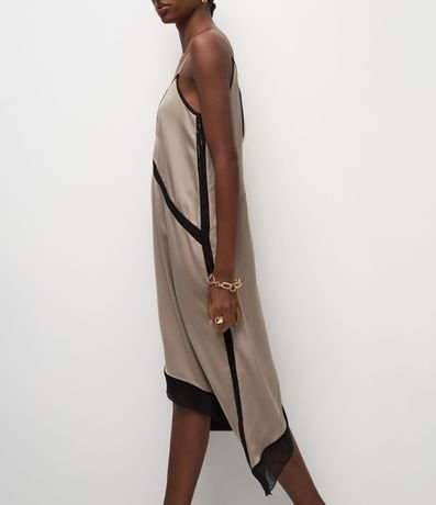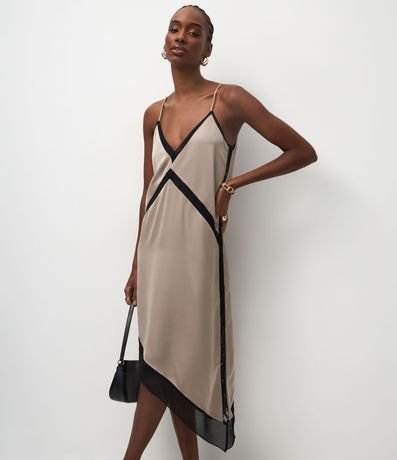 Ref: Vestido midi feminino, confeccionado em tecido acetinado, com decote V, detalhes de renda e barra assimétrica.