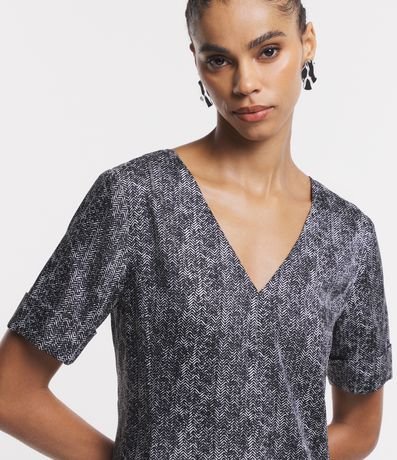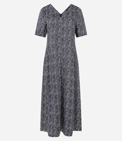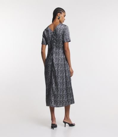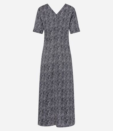 Ref: Vestido midi feminino, confeccionado em tecido acetinado, com decote V frente e costas e estampa abstrata.