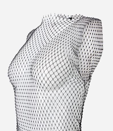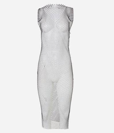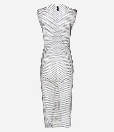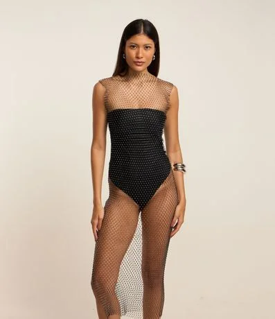 Vestido em tela, com decote canoa, sem manga, transparência e brilhos.