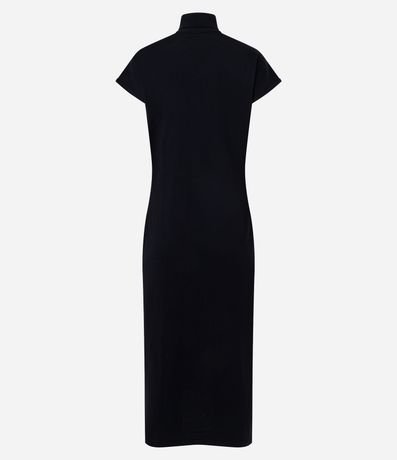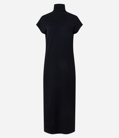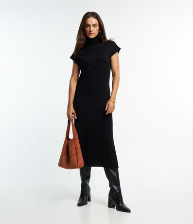 Ref: Vestido em tricô modelo midi, com gola alta dobrada, manga curta sem cava e detalhe de fendas laterais.