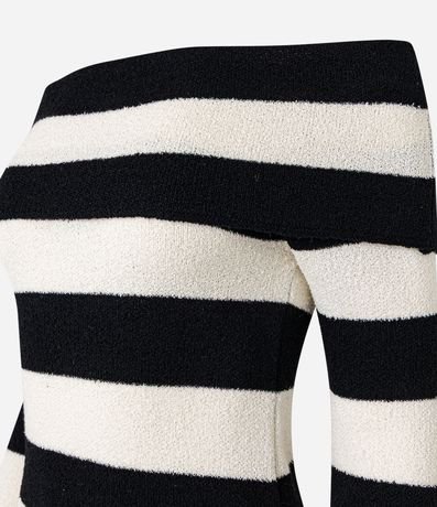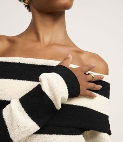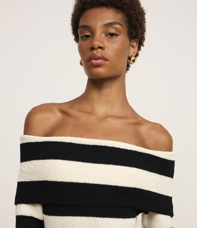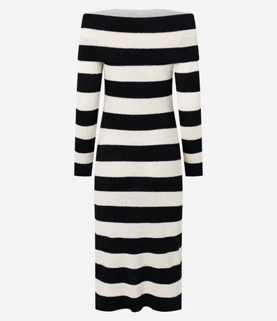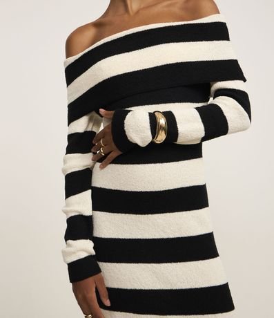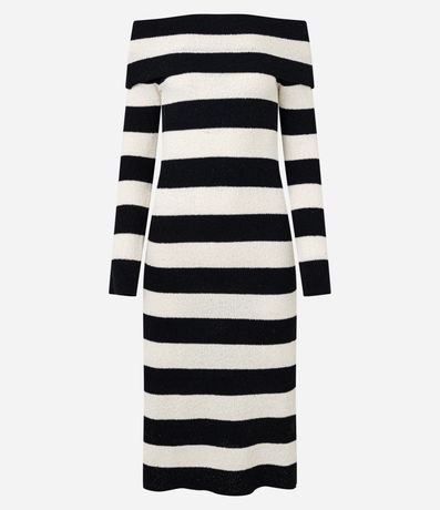 Ref: Vestido midi confeccionado em tricô leve texturizado e estampado de listras. A peça tem decote reto ombro a ombro e mangas longas.