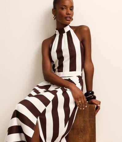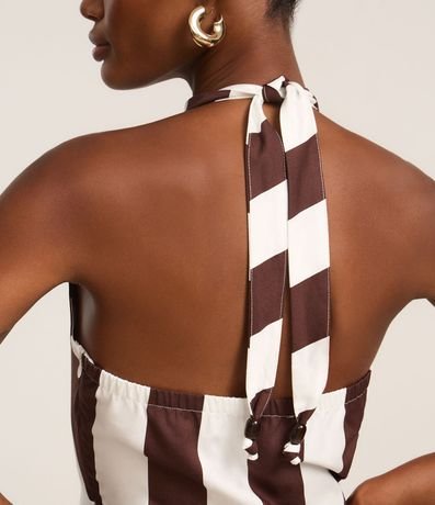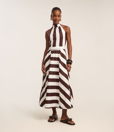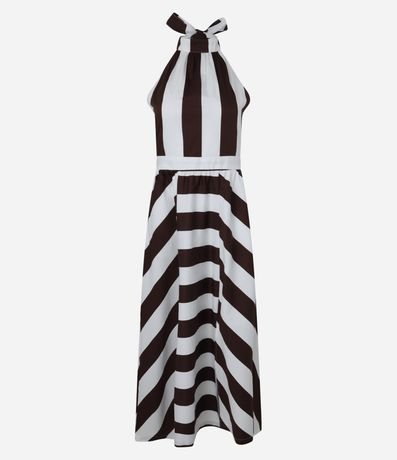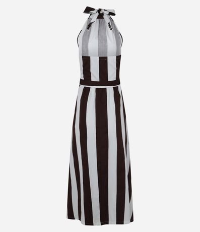 Vestido feminino de modelo midi, confeccionado em tricoline. Possui gola alta com amarração, sem mangas, frente única e com estampa listrada.