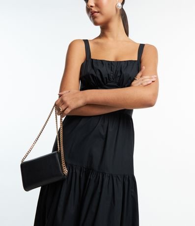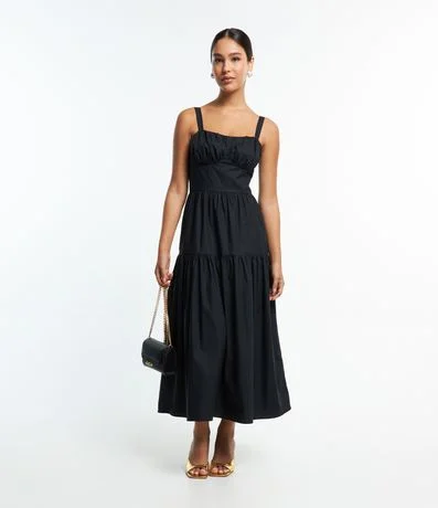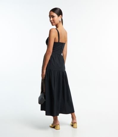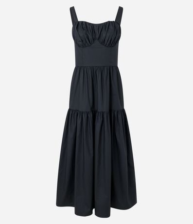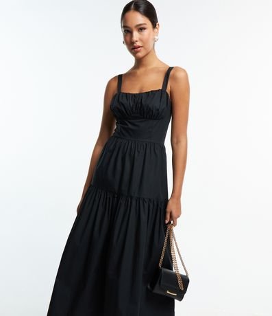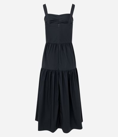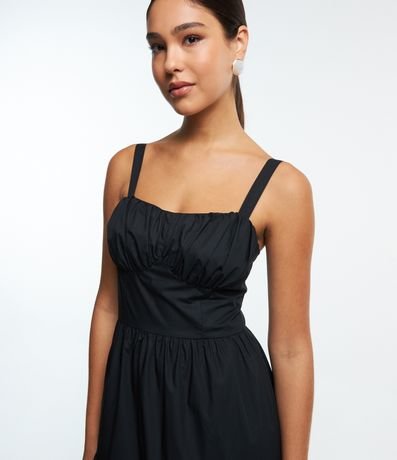 Ref: Vestido midi feminino, confeccionado em tricoline, com alças médias e bojo franzido. A peça também conta com recortes franzidos na saia e zíper nas costas.