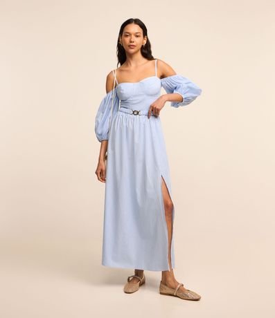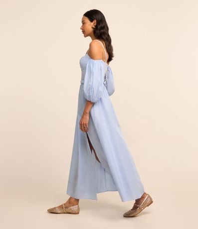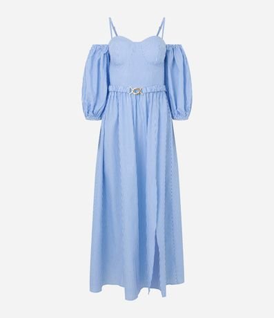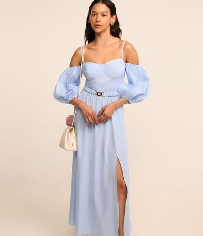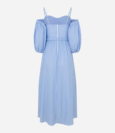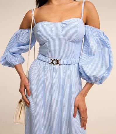 Ref: Vestido midi feminino, confeccionado em tricoline, com decote ombro a ombro, alcinha fina, mangas bufantes e cintinho. A peça conta também com estampa listras.