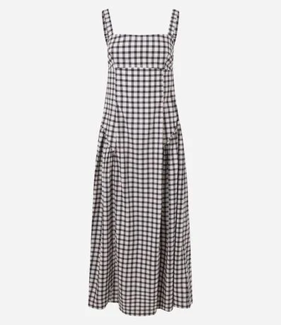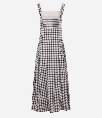 Ref: Vestido feminino midi em tricoline confeccionado com algodão mais sustentável. Possui estampa xadrez, alças largas, decote quadrado, busto com recorte com melhor encaixe, saia ampla com caimento solto e flores sutis sob o xadrez.