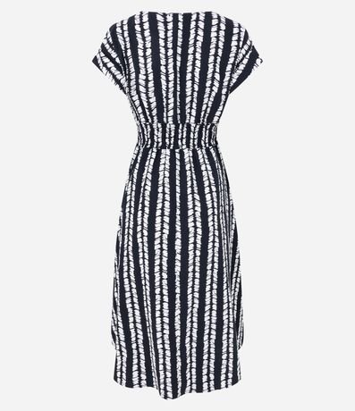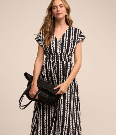 Ref: Vestido midi feminino, confeccionado em tricoline, com decote V, mangas curta, lastex na cintura e estampa abstrata.