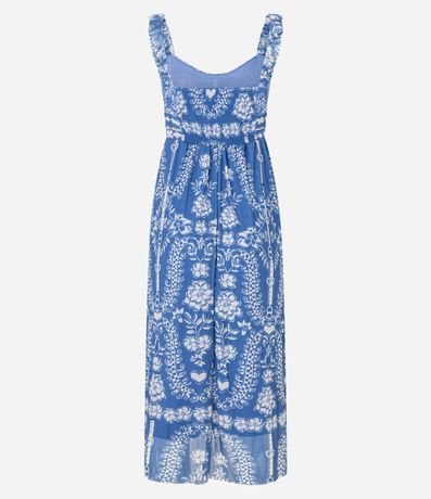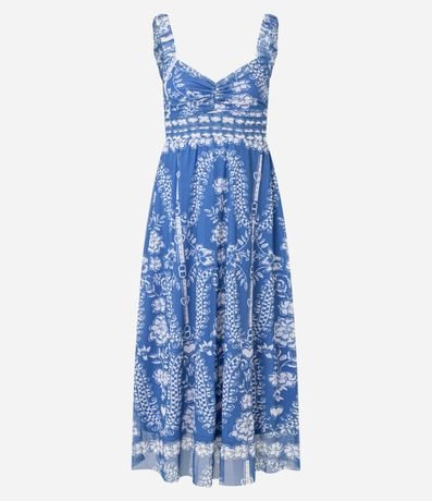 Vestido feminino em tule, modelo midi, com decote coração franzido, com alças finas e estampa étnica.