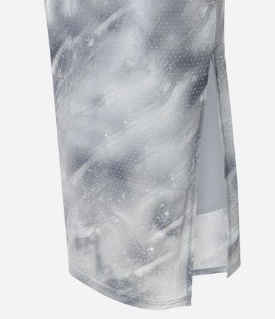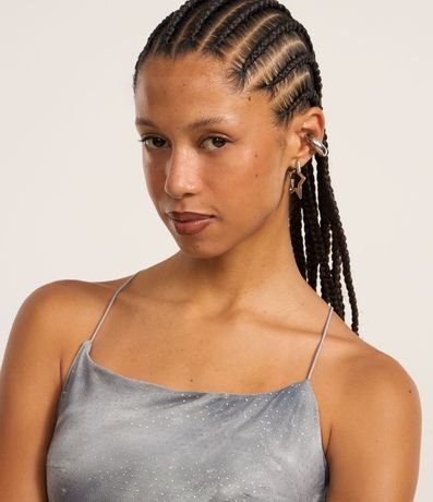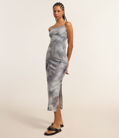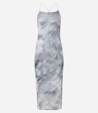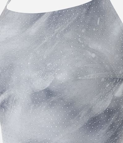 Ref: Vestido de tule com estampa abstrata, glitter flocado e alças finas cruzadas.