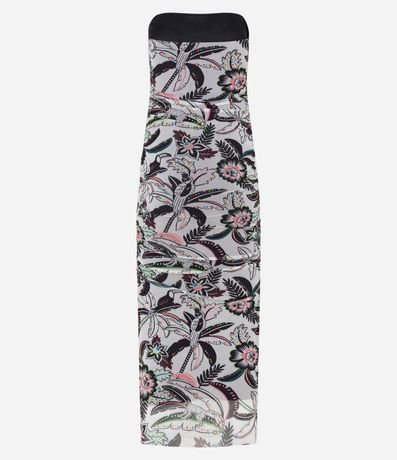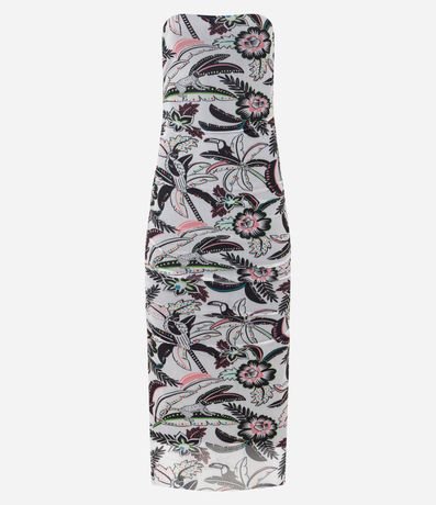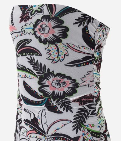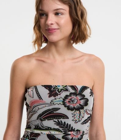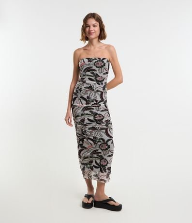 Vestido midi com decote tomara que caia, franzidinho na lateral e estampa tropical com folhagens.