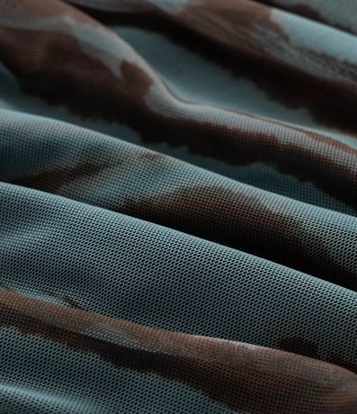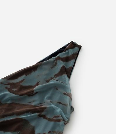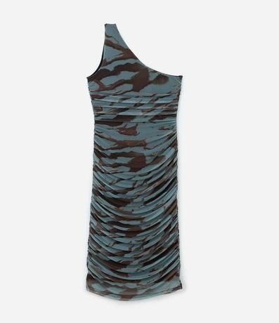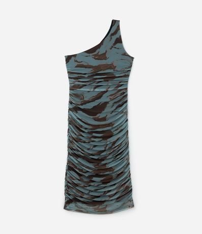 Ref: Vestido feminino confeccionado em tule com melhores práticas ambientais, peça com um ombro só de tira larga, no modelo midi com estampa manchada contrastante.