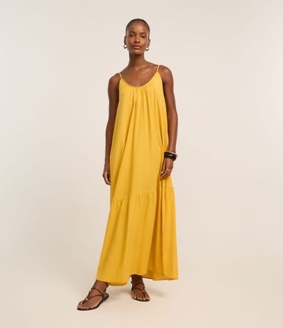 Ref: Vestido feminino confeccionado em viscose e linho, de material mais sustentável. Possui alças finas, decote redondo com preguinhas e recorte na barra.