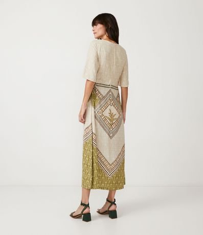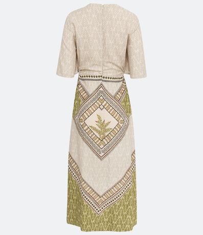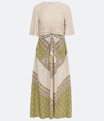 Ref: Vestido midi em viscolinho, com estampa de folhagem, recorte cut out na cintura e mangas curtas.