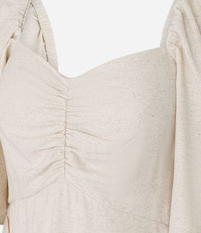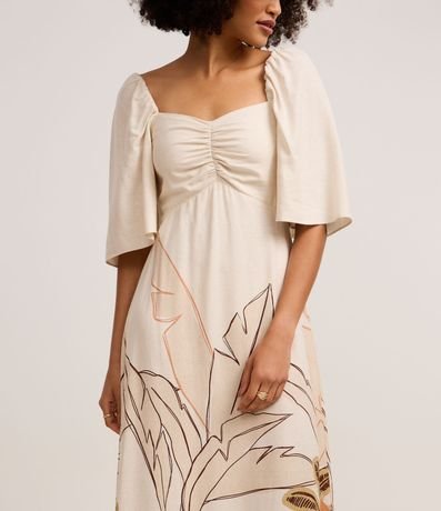 Vestido reto midi de mangas godês, confeccionado em viscolinho, com decote coração com franzido, lastex nas costas e estamparia de folhagens. Este produto possui viscose certificada em sua composição, sendo ambientalmente mais responsável.