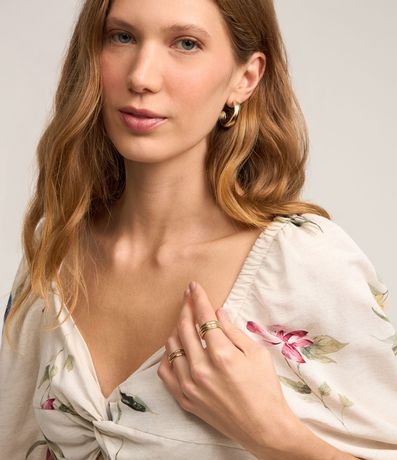 Vestido midi feminino, confeccionado em viscolinho, com decote coração, detalhe vazado, mangas curtas bufantes e estampa floral.