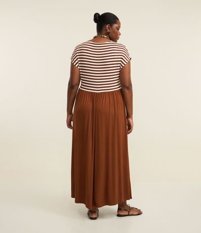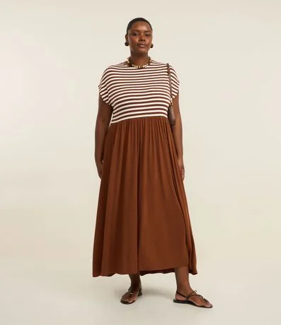 Ref: Vestido midi com mangas curtas, confeccionado em viscose certificada e boas práticas ambientais. Modelo com gola redonda, corpo listrado e saia lisa marrom, garantindo conforto e caimento perfeito. Ideal para compor looks casuais.