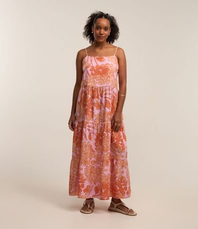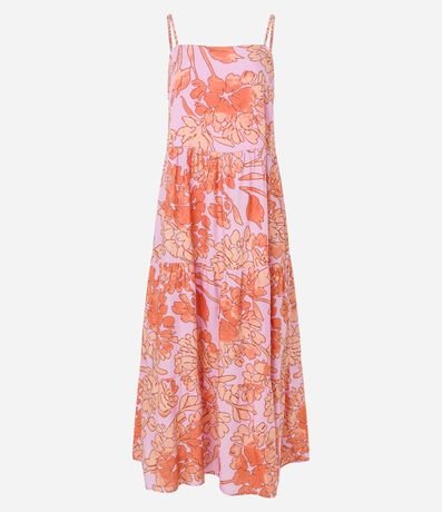 Vestido midi feminino, confeccionado em viscose, com decote reto, alcinha fina, recorte na cintura e estampa floral.