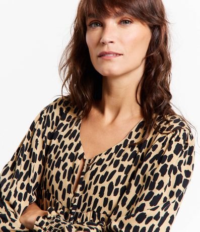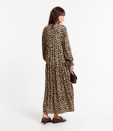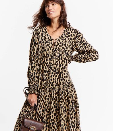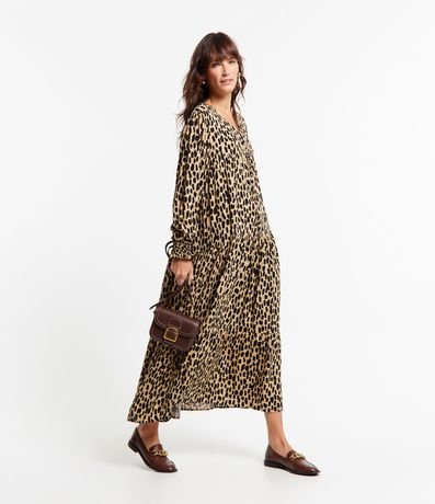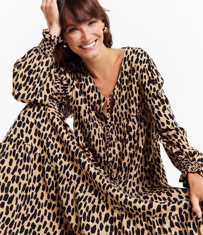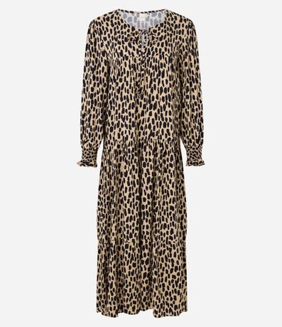Vestido midi em viscose, com amarração na gola, mangas longas, punhos ajustados e recortes. A peça também possui estampa animal print onça.
