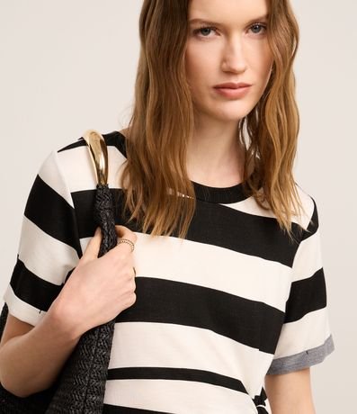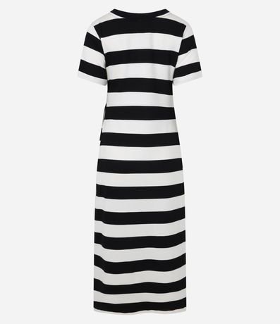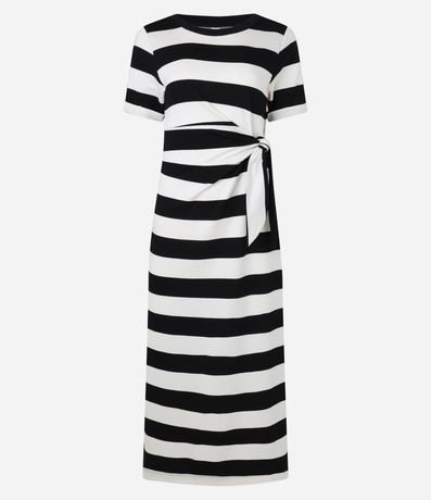 Ref: Vestido feminino midi em viscose com estampa de listras, mangas curtas e amarração na lateral da cintura.