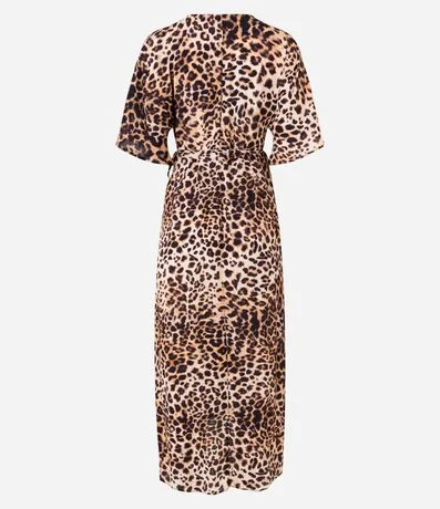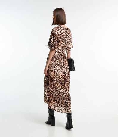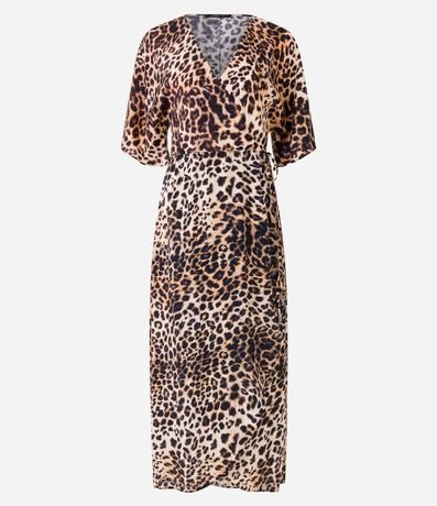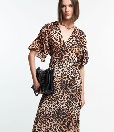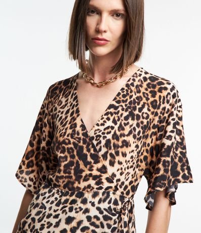 Ref: Vestido com comprimento abaixo dos joelhos confeccionado em viscose com mangas curtas com babados além de decote V transpassado. Conta com amarração na cintura e estampa de animal print de onça.