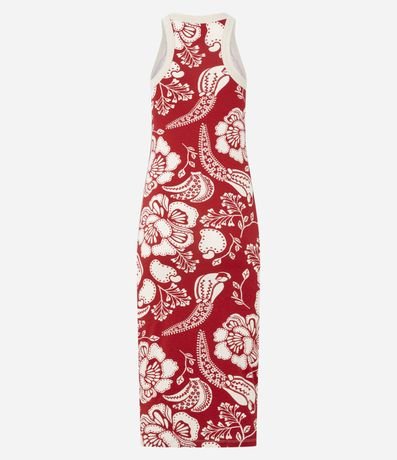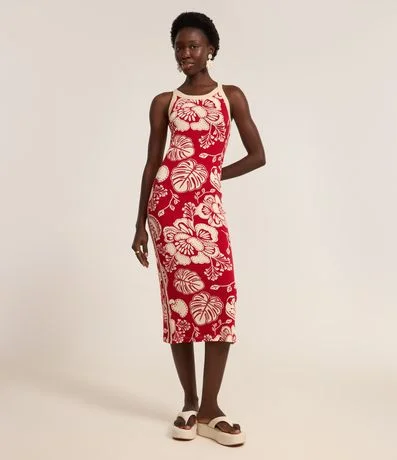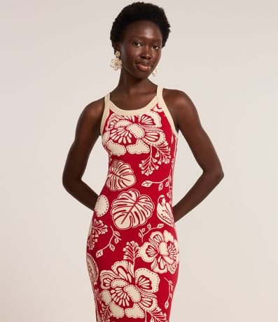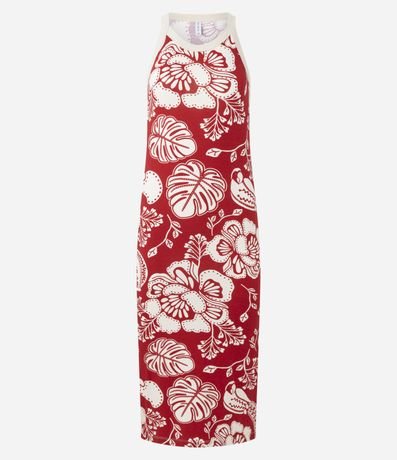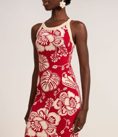 Ref: Vestido feminino confeccionado em viscose certificada com boas práticas ambientais, peça no modelo midi com decote redondo, sem manga e estampa floral pontilhada bicolor.