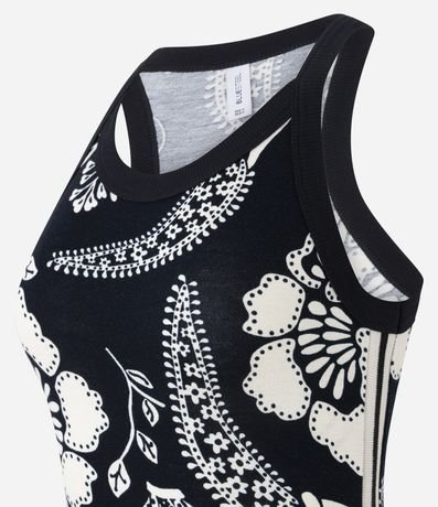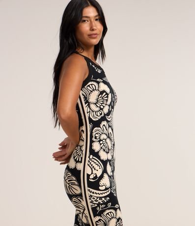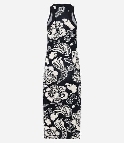 Ref: Vestido feminino confeccionado em viscose certificada com boas práticas ambientais, peça no modelo midi com decote redondo, sem manga e estampa floral pontilhada bicolor.