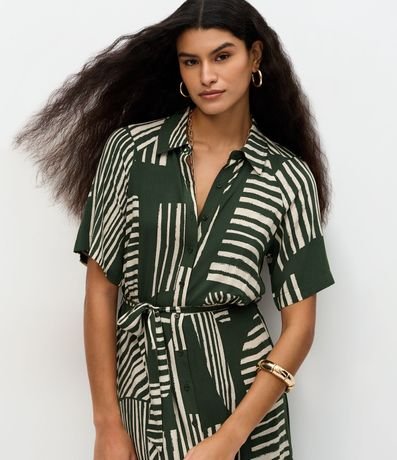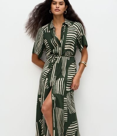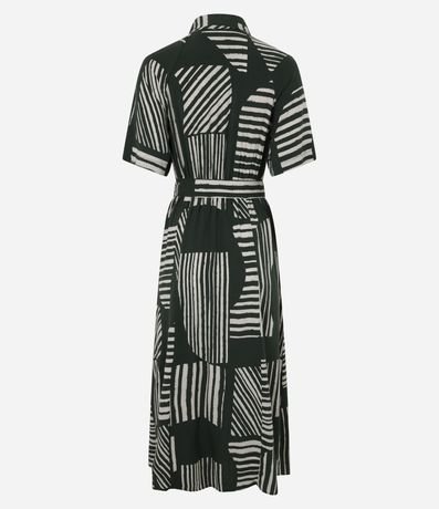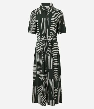 Vestido midi feminino confeccionado em viscose mais sustentável. Possui mangas curtas, modelagem reta, gola camisaria, fechamento frontal por botões, estampa geométrica e faixa do próprio tecido para amarração na cintura.