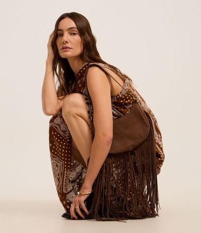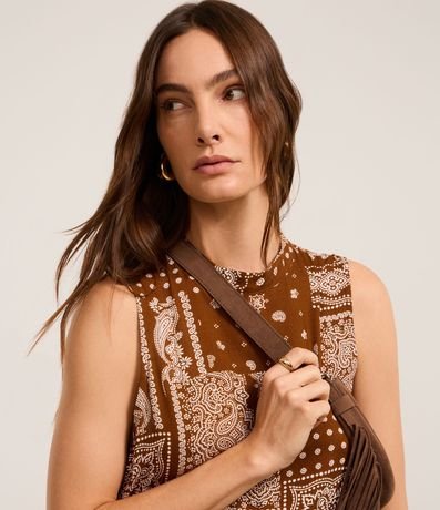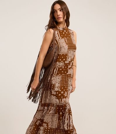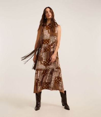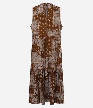 Ref: Vestido evasê midi, confeccionada em viscose, com gola redonda e sem mangas. A roupa tem estamparia paisley. Este produto possui viscose certificada em sua composição, sendo ambientalmente mais responsável.