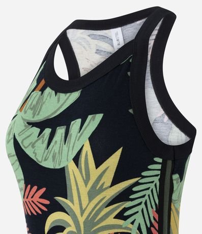 Ref: Vestido feminino confeccionado em viscose certificado com elastano, peça no modelo midi com decote redondo, sem manga e estampa de folhagem tropical.