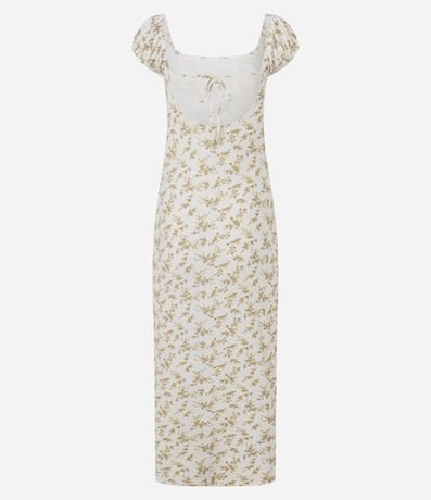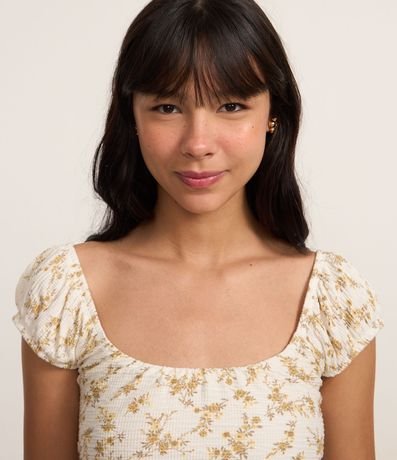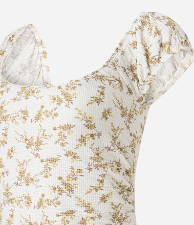 Ref: Vestido confeccionado em malha de viscose texturizada e estampada de mini flores (liberty). A peça tem manguinhas curtas com elástico e amarração nas costas.