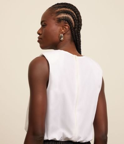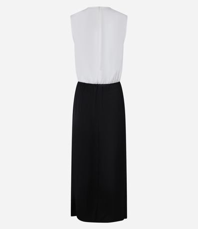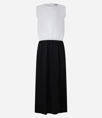 Vestido bicolor confeccionado em tecidos com acabamentos diferentes. A blusa sem mangas é feita em tricoline de algodão mais sustentável e a saia é de cetim. O contraste entrega um look high low -- descolado e elegante.