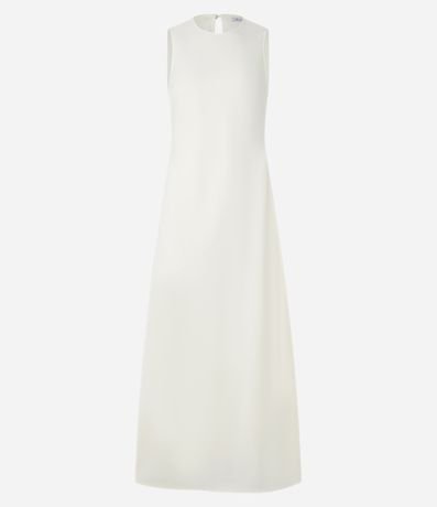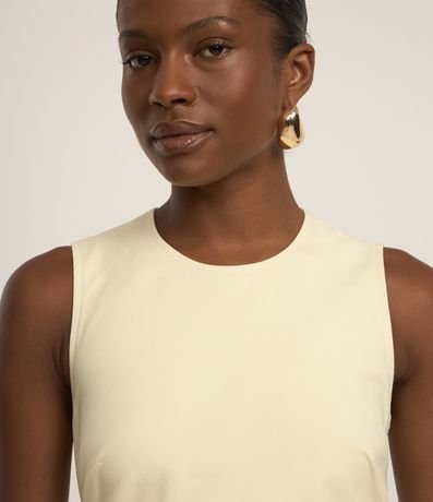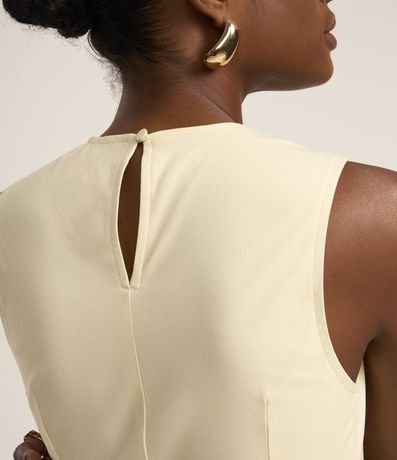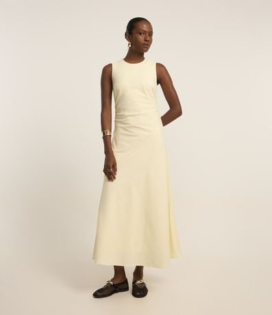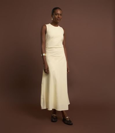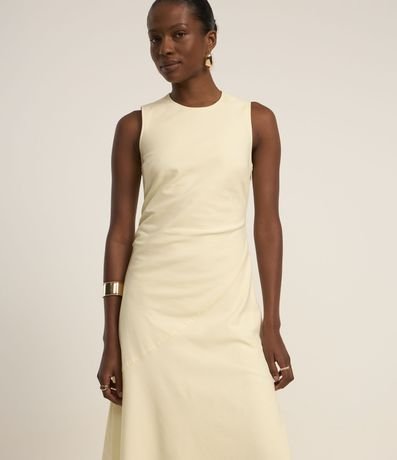 Ref: Vestido feminino confeccionado em bengaline, no modelo midi evasê com decote redondo, sem manga e detalhe drapeado.
