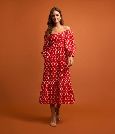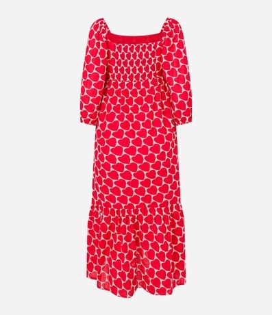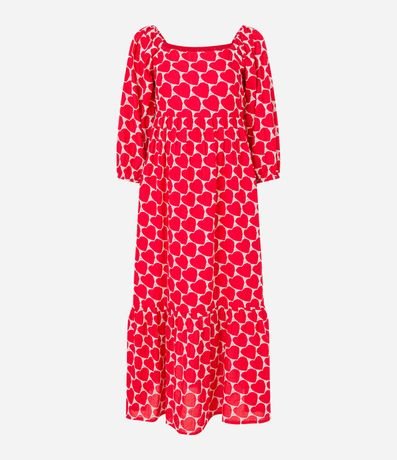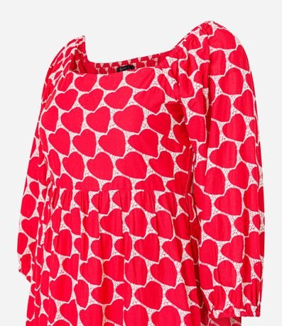 Ref: Vestido feminino, modelo midi evasê, confeccionado em laise mais sustentável, decote redondo, manga bufante. Peça com bordado de coração e recorte na barra.