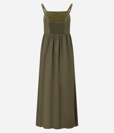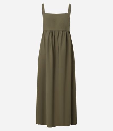 Ref: Vestido feminino confeccionado em sarja mais sustentável com boas práticas ambientais, peça no comprimento midi e modelo evasê, com alça fina ajustável, decote quadrado e lastex nas costas.