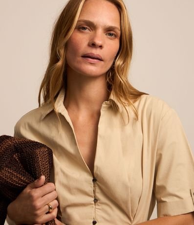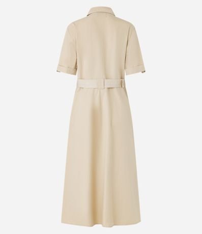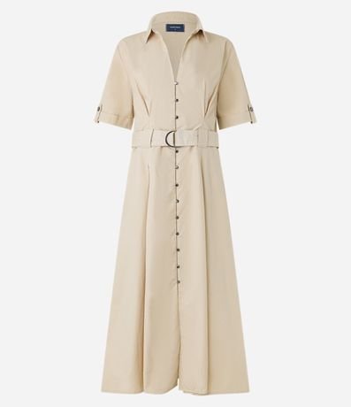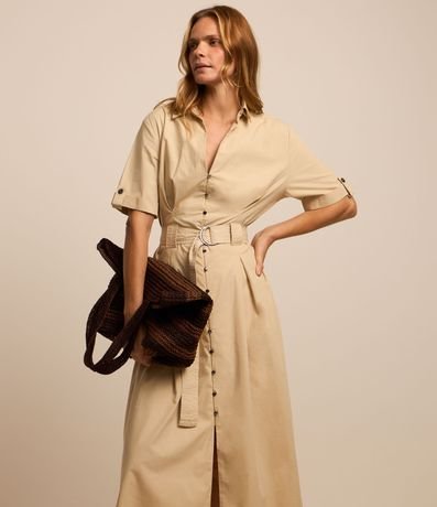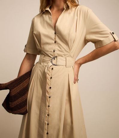 Vestido feminina confeccionada em sarja mais sustentável, gola com lapela e decote em v, abotoamento frontal e manga curta. Peça no modelo midi evasê com cinto.